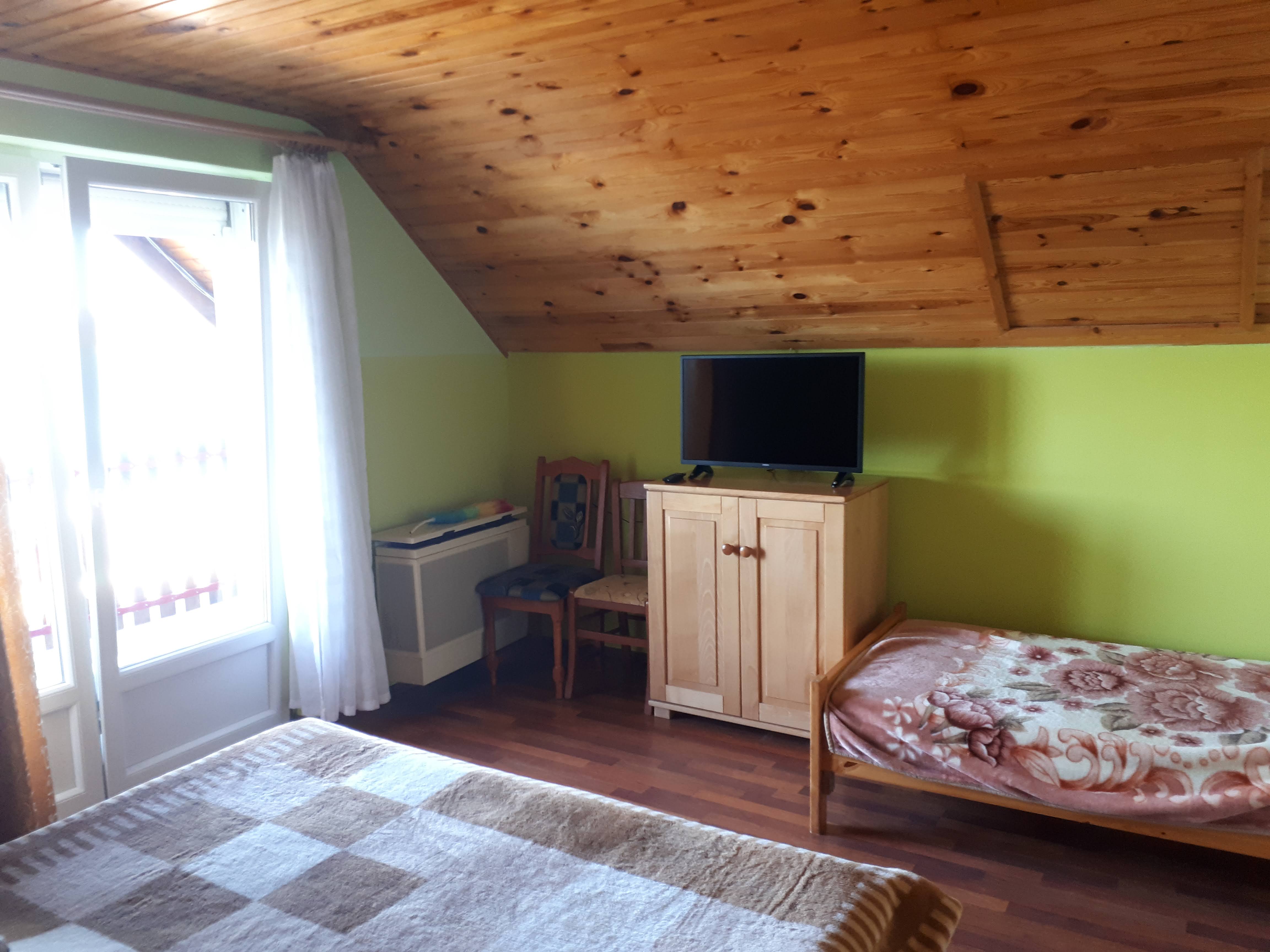 Nagyobb házaink (ikerházak) ideálisak nagyobb családok és baráti társaságok számára. Az épületek külön bejárattal és zárt udvarral rendelkeznek, igény szerint egymással is összenyithatók, így rugalmas elhelyezést biztosítanak. A házak két szintesek. A földszinten van egy zárt előtér, itt található két egyszemélyes heverő, ezt főleg horgászok számára ajánljuk, de mozgáskorlátozott vendégeink számára is alkalmas. Az emeleten van két szoba. Mindkét szobánk három személyes, 1-1 francia ággyal és 1-1 heverővel ellátott. A nagyobbik szoba a tóra néz, nagy erkéllyel rendelkezik. A kisebbik szobából az udvar látható, itt egy kisebb balkon van. Így a ház maximum 8 fő befogadására alkalmas.