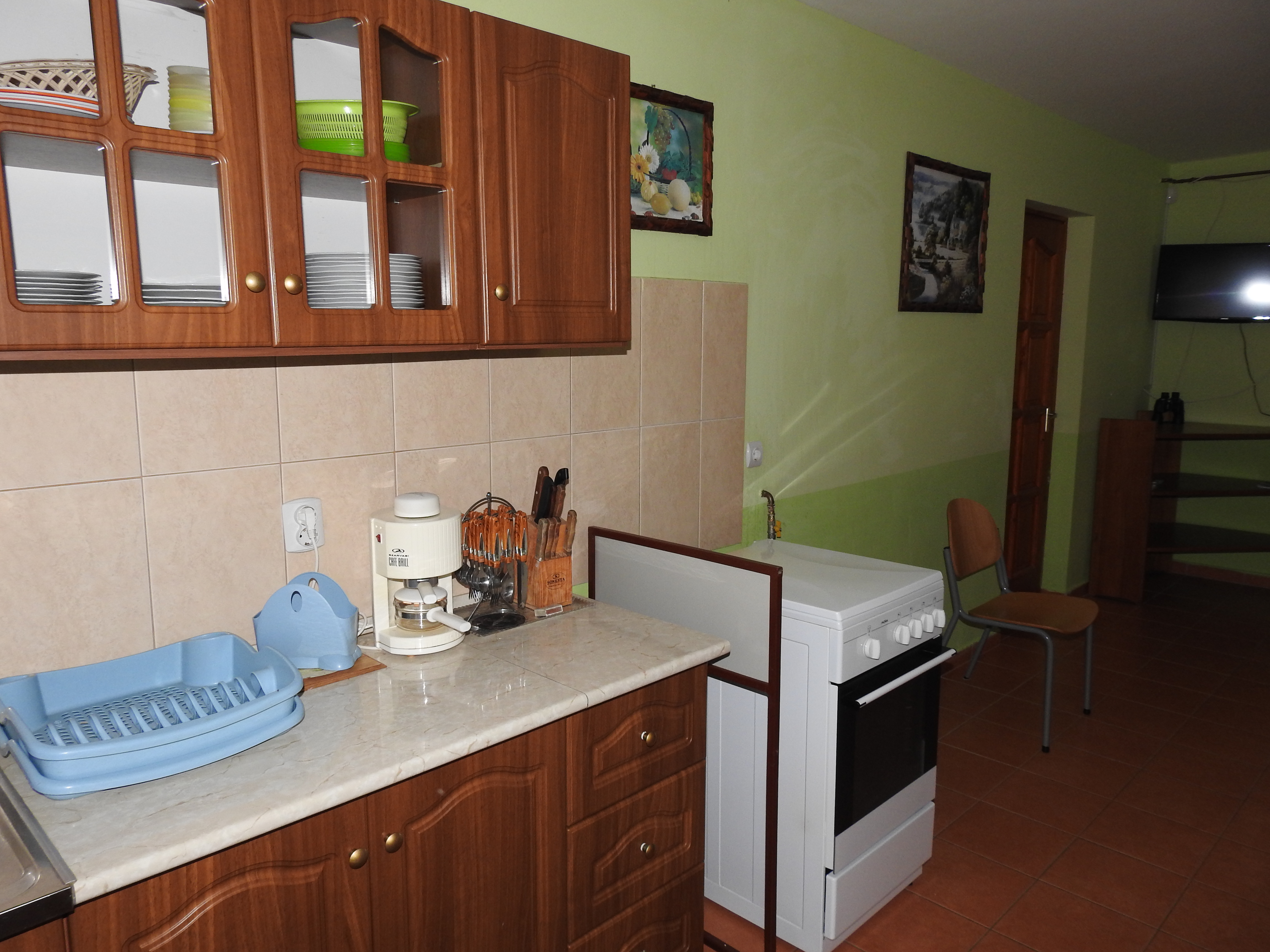 - felszerelt konyha (mikrohullámú sütő, gáztőhely, kávéfőző, edények, evőeszközös, hűtőszekrény mélyhűtővel)